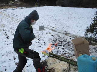 公民館長さんが御神酒をふりかけ、合掌したのち、火入れをします。