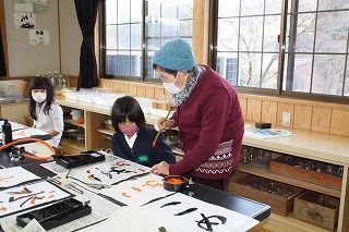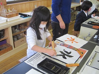 本校では、7年ほど前から書き初め大会の講師として、下直瀬のK先生にずっとお世話になっています。K先生は今年も快く引き受けてくださいました。各学年の題材を事前にお知らせしていましたが、全ての学年のお手本まで作って持ってきてくださいました。