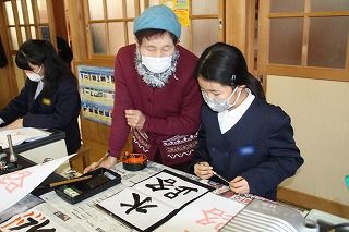 朱墨を持ってK先生がアドバイスをされると、先生の筆遣いを見習って自分のものにしようと練習を繰り返していました。