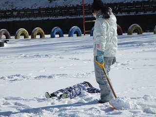 真っ白の何も描かれていないキャンバスのような運動場に足跡を思う存分残す子、足跡だけでなく、自分の体で大の字を残す子、友達や先生と雪合戦をする子、砂風呂ならぬ雪風呂を堪能する子(冷たくなかったのかな?)など、様々に楽しんでいました。高学年の女子は、出入り口の雪をほうきではいてくれていました。