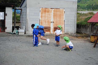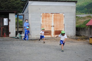 今日はとてもいい天気だったので、外遊びもできました。久万幼稚園の皆さんの人数が多いからと、「リレーごっご」をして遊ぶことができました。もともと走るのが大好きな直瀬っ子です。普段できない遊びで存分に楽しみました。