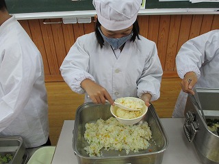 今日の給食は8人分。全体の分量を8等分するとどのくらいになるかを考えて、つぎ分けます。これこそ、生活に生きる算数の力です。