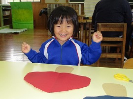 幼稚園では、工作に「全集中」です。年少さんは、画用紙に引いた線のところを上手に切って、キノコをつくりました。年長さんは、折り紙です。タブレットで折り方を確認しながら、頑張ってキノコをつくりました。