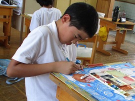 低学年は、国語の勉強です。1年生は、「うみのかくれんぼ」で、生き物がどんなかくれ方をしているのか、教科書を読んで確かめています。2年生は、言葉や漢字の仲間分けをしています。