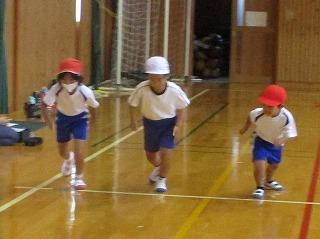 かけっこの入退場、走り方の確認もしました。体育館なので、本気を出さずに・・・。