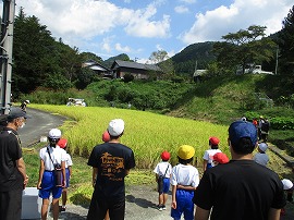 田んぼの稲は、田植えから3ヶ月半が経ち、こんな様子です。いつも、田んぼの水の管理などの世話をしてくださっているおかげで、ここまで成長しました。保護者のみなさん、本当にありがとうございます。