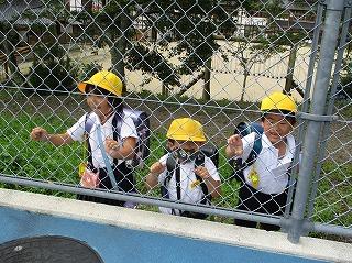 先に下校の1・2年生は、プールの外からうらやましそうに見ています。