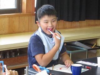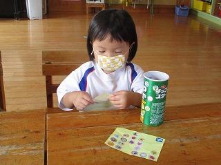 幼稚園では、月に1回の「お楽しみ会」です。歌を歌ったり、金魚すくいなどのゲームをしたりして、楽しかったですね。的当ての後、ごほうびのアイスをおいしくいただきました。