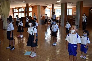 幼稚園、低・中・高学年から1人ずつ代表になり、1学期に頑張ったことや夏休みのめあてを発表しました。みんな、立派な態度で発表できましたね。