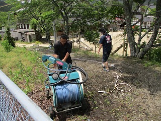 プール清掃で使っていただいたポンプに今度は消毒液を入れ、大きな桜の木や植え込みにある樹木を一気に消毒してくださいました。