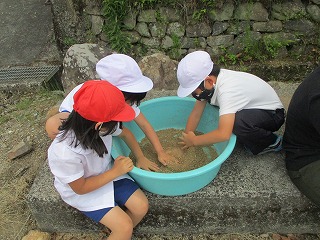 1・2年生はどろだんごあそびの準備。だんごにまぶすきれいな土を確保するため、真砂土をふるいにかける作業を、木陰で行っていました。