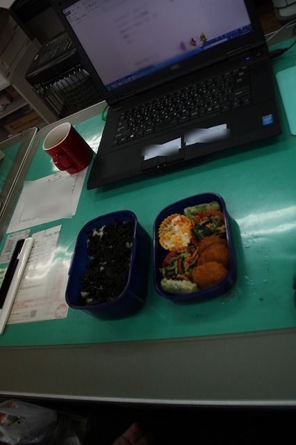 次は、B先生。ごはんに乗っかる昆布が豪快、パンチがきいています。おかずは、N●レイさんか、○ハニチロさんに作っていただいたものかな?近くのスーパーで買ったえびのかき揚げが添えられています。カロリーの摂りすぎに注意したいですね。