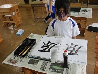 3・4年生は毛筆で「原」の書写を。どの子も筆づかいが上手です。全員の作品を掲載できなくてごめんなさい。