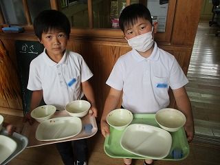 そして、給食が終わる10分前、1・2年生が食器を持って職員室にやって来ました。何事かと廊下に出ると・・・。