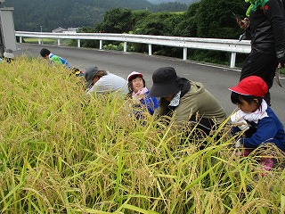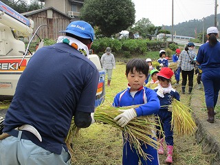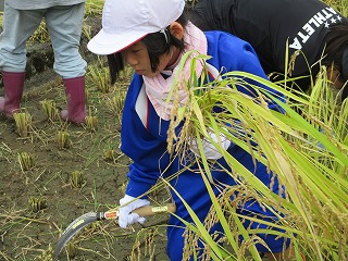 コロナ対策のため、例年お世話になっている高齢者の方はお呼びせず、保護者の皆様と子ども、教職員のみで行いました。少ない人数でしたが、子どもたちの手際のよさに驚きました。コンバインで作業できない端の部分を、保護者の方とともにあっという間に刈り取ることができました。