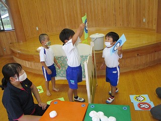 「じゃんけん玉取り」では、子ども対子ども、子ども対先生たちなどいろいろな対戦をしました。それぞれ3個の持ち玉のうち、負けたら相手に1個渡さなければなりません。