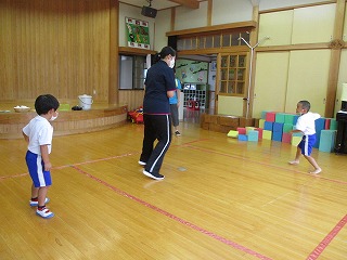 10秒間当てられなければ逃げる人の勝ち。子どもはすばしこいので、なかなか当てられませんでした。園長は1秒で当てられました。