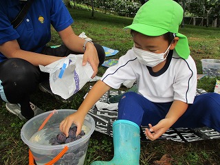 収穫したぶどうをバケツの水に浸し、さっそく食べ始めました。大きな実をまるごと口の中に入れてちゅるんと中身を出す子、丁寧に皮をむいてその実を食べる子、まずは一房全ての実の皮をむいて、後で一気に食べる子など、様々な食べ方をしていました。