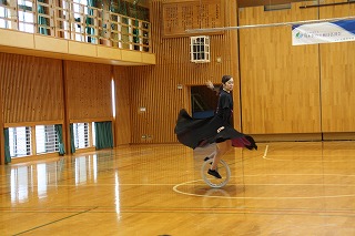 模範演技の前に、子どもたちの技も披露しました。運動会でも成功させたサークルや大車輪、大小の風車です。2年生の男子も加わり、11名での大技を成功させました。その技を先生方に褒めていただいたことはとても自信になったことでしょう。